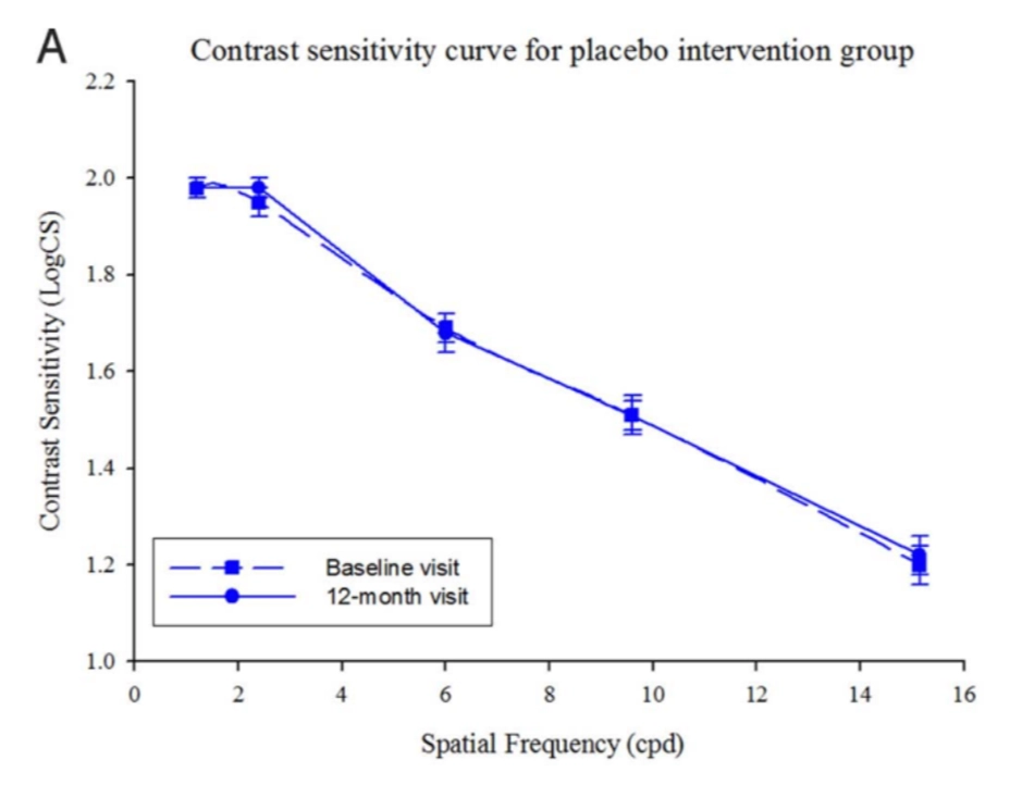 根據《眼睛與視覺科學》期刊指出,與安慰劑組相比,每天補充10mg葉黃素、2mg玉米黃素、10mg消旋玉米黃素時,才能夠改善眼睛的對比敏感度。