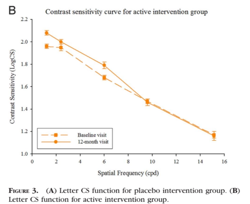 ▲實驗顯示,橘色實線的實驗組,在補充12個月後,可看出對比敏感度有所提升,視野更加清晰